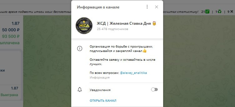 ЖСД | Железная Ставка Дня – очень подозрительный канал, в котором каппер не подтверждает навыки прогнозирования, не афишируется, а также скрывает свой реальный заработок на ставках. Потерять деньги здесь очень легко.
