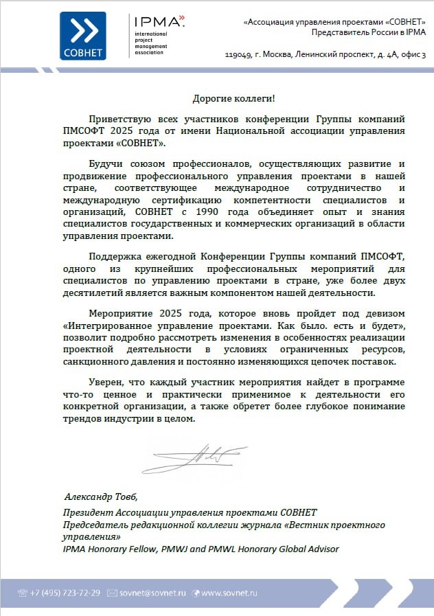 #Конференция2025 🏆 XXIV Международную конференцию «Интегрированное управление проектами. Как БЫЛО, ЕСТЬ и БУДЕТ» поддержал Александр Товб 🔝 Президент Ассоциации управления проектами СОВНЕТ, 🔝 Председатель редакционной коллегии журнала «Вестник проектного управления", 🔝 IPMA Honorary Fellow, 🔝 PMWJ и PMWL Honorary Global Advisor, Это не просто почётная поддержка, а настоящий сигнальный маяк для профессионального сообщества. Когда лидеры и эксперты высокого уровня видят ценность в событии, это означает, что мы движемся в правильном направлении - формируем площадку, где обсуждаются ключевые тренды, вызовы и решения для развития проектного управления в России и в мире. ❤️ Напомним 10–12 сентября 2025 года, Сочи (Красная поляна) пройдет XXIV Международная конференция «Интегрированное управление проектами. Как БЫЛО, ЕСТЬ и БУДЕТ» — одно из ключевых профессиональных событий в сфере управления проектами и капитального строительства.