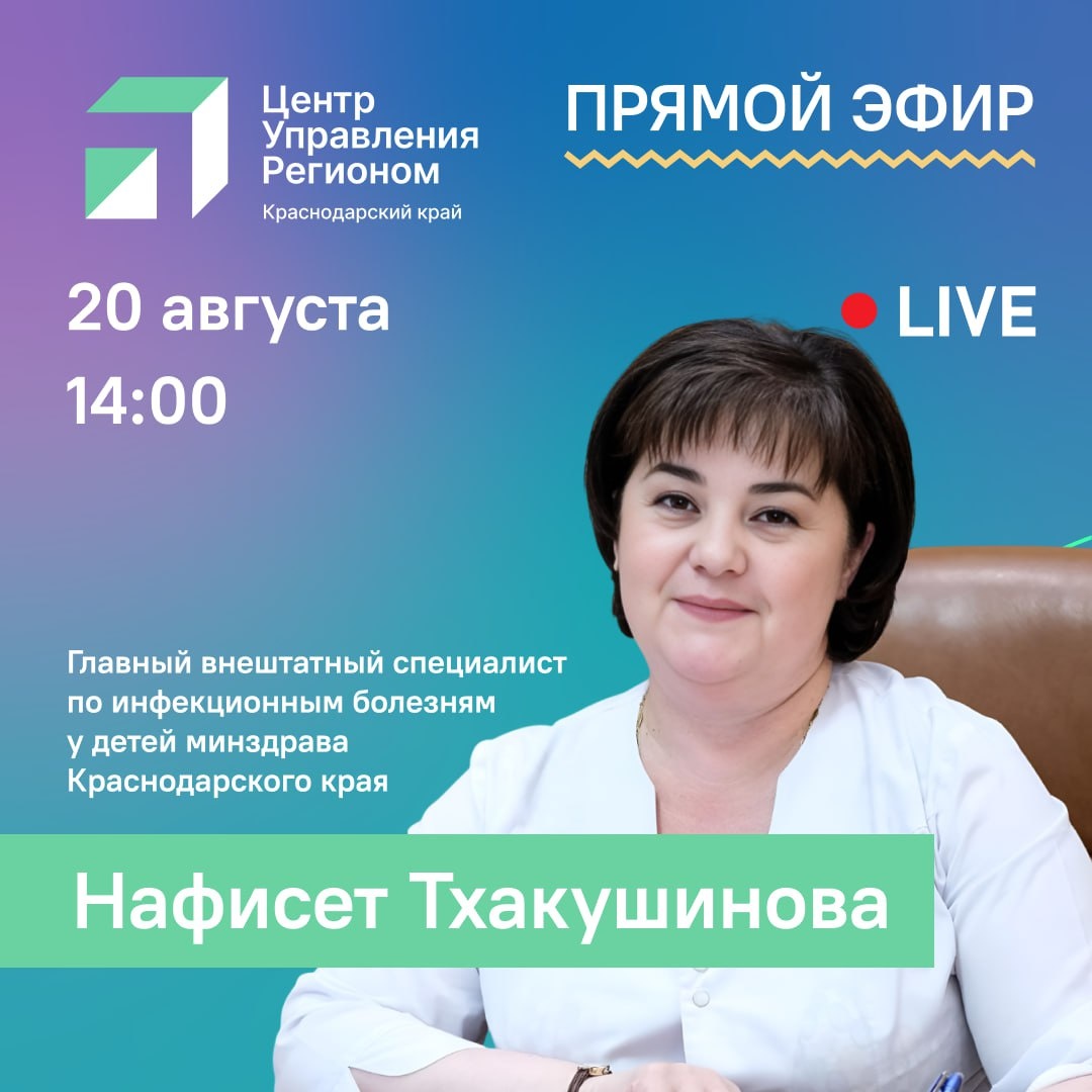 🕐🕐🕐 Главный внештатный специалист по инфекционным болезням у детей министерства здравоохранения Краснодарского края Нафисет Тхакушинова ответит на вопросы жителей в прямом эфире сообщества «Краснодарский край». Трансляция начнётся 20 августа в 14:00. Подключайтесь к эфиру в социальных сетях «Вконтакте» и «Одноклассники», чтобы узнать о профилактике острых кишечных инфекций в летний период. Задать интересующий вопрос Нафисет Тхакушиновой можно в комментариях к трансляции!