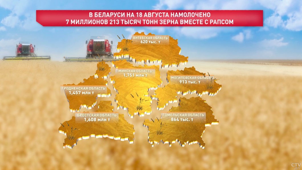 В Беларуси намолочено более 7,2 миллиона тонн зерна вместе с рапсом