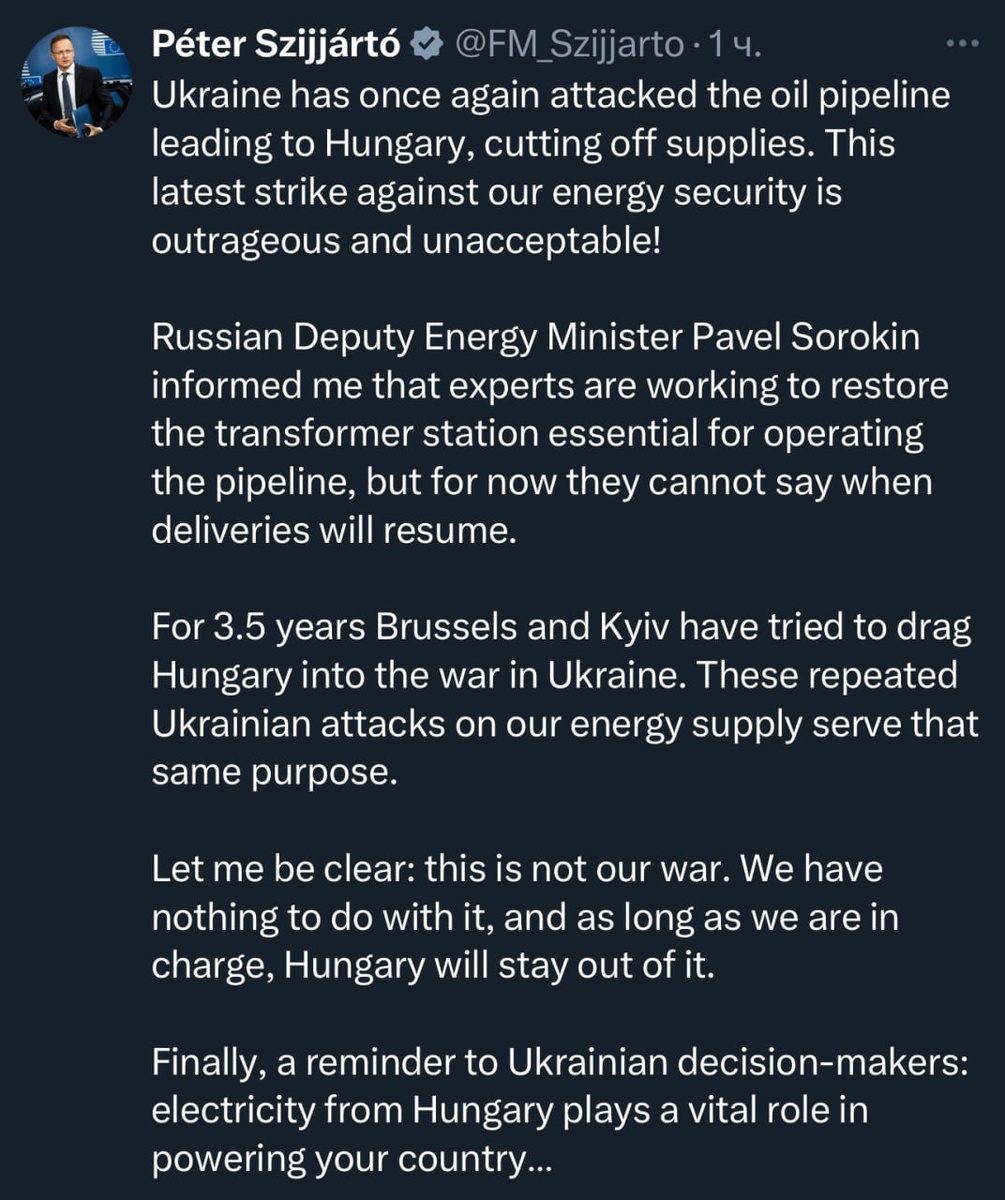 ⚡️ Глава МИД Венгрии Петер Сийярто обвинил Украину в атаке на нефтепровод, остановившей поставки нефти в Венгрию