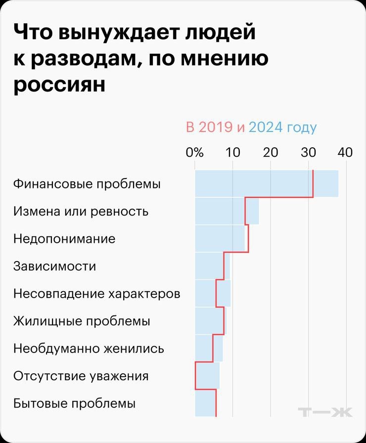 А вот, что вообще поразило, так это график в причине развода - «отсутствие уважения». В 2019 об этом не упоминали. Просто было чуть-чуть больше «недопонимания».