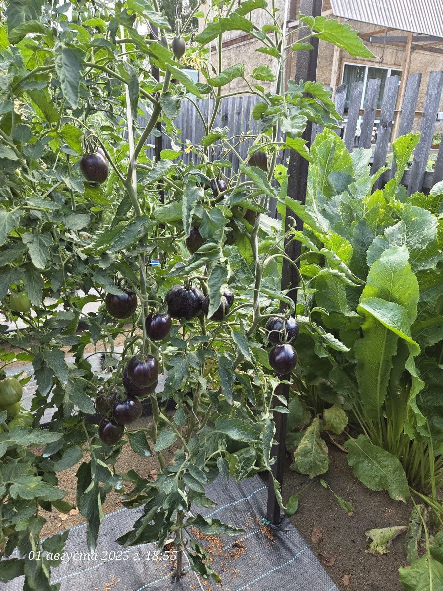 Этот сорт выращивала впервые. Много о нем читала, встречала в коллекциях у многих томатоводов, но почему-то вырастить его не захотела. Однако, два разных коллекционера прислали мне семена этого сорта в подарок к моему заказу. И этой весной я поняла, что надо все-таки вырастить этот сорт. Сеяла семена 22 марта. Рассада ничем не выделялась. Единственно, при малейшем стрессе проявлялся антоциан на стволе и иногда на листве. В остальном, если не смотреть этикетку, то понять, что за сорт перед тобой на подоконнике было нереально. Заморозок тоже рассада на ПМЖ пережила сносно. Первая кисть сохранена, пострадало совсем мало листьев. А вот с завязываемостью летом у Гаргамель были проблемы. Часть кистей на кусту полностью оказались сброшены. Честно, не могу сказать, что именно спровоцировало такую реакцию — жара или холод. У нас нынче было все: и холод с дождями, и жара +35 ° С. Куст к 1 августа достиг роста 1,5 метра.