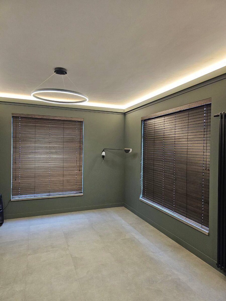 Если в комнате есть деревянные элементы (панели, молдинги), можно подобрать жалюзи в тон для целостного дизайна.
