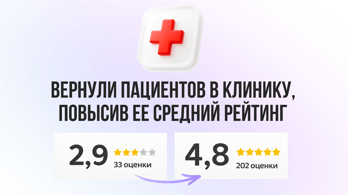 Это позволило нам встроить сбор отзывов в стандарт обслуживания — так, чтобы пациенты охотнее делились положительным опытом. Ведь в реальности большинство воспринимает хорошее обслуживание как должное и не считает нужным писать об этом. Наша задача была — мягко изменить эту установку и превратить довольных пациентов в активных адвокатов клиники.