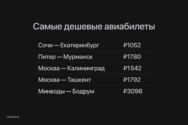 Цифра дня: всего ₽947 стоил самый недорогой авиабилет этим летом. За эту цену можно было улететь из Сочи в Уфу, как за поездку на такси. Мы запросили у «Авиасейлс» рейтинг самых экономичных маршрутов сезона. Вот что стоит запомнить: – Калининград; – Мурманск; – Екатеринбург; – Ташкент; – Минск; – Бодрум. Теперь можно смело ловить билеты для спонтанных поездок в этих направлениях. Наш уютный канальчик 🤖 Анимация | СhatGPT-4 | Помощь с резюме