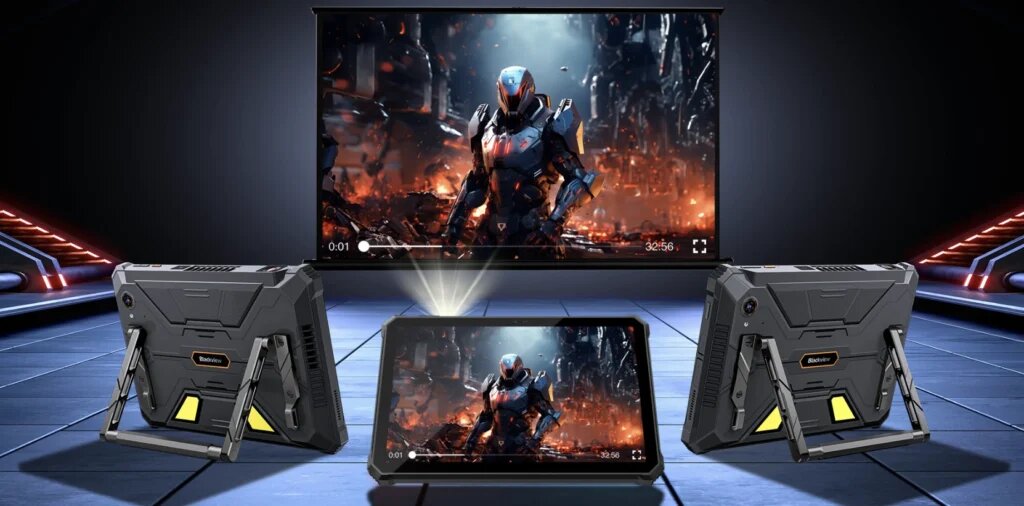 Компания Blackview выпустила защищенный планшет со встроенным DLP-проектором (на основе микрозеркальной матрицы) Blackview Active 12 Pro. Он позволяет получать изображение диагональю 120 дюймов с разрешением 1080p и яркостью 200 люмен. Проецировать кино/фотографии/игры можно даже на неровные поверхности. В наличии массивный аккумулятор емкостью 30 000 мАч с поддержкой быстрой зарядки мощностью 120 Вт. Цена нестандартного гаджета составляет от 529 долларов или около 42 тысяч рублей по текущему курсу.