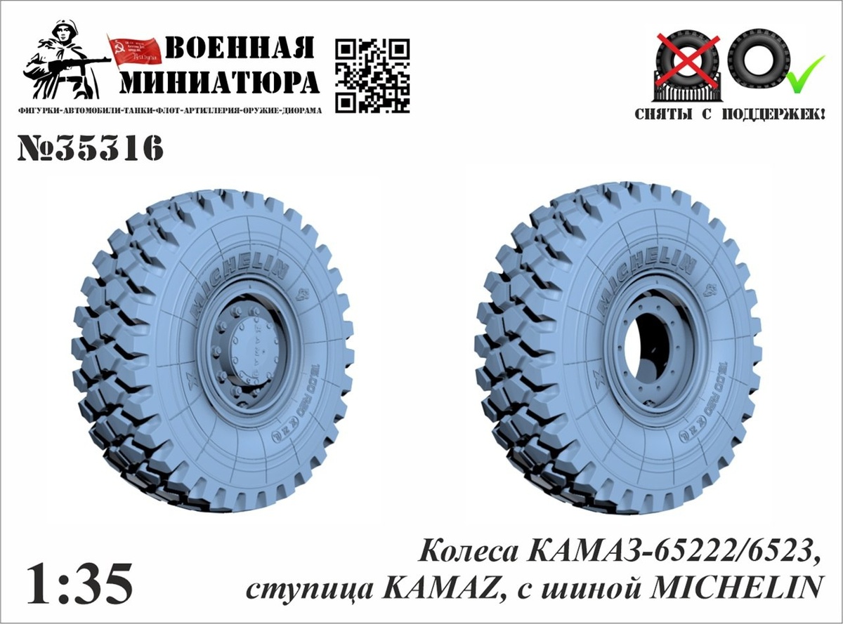 Ставропольская "Военная миниатюра" выпускает на 3D-принтере колеса для моделей КамАЗ-65222/6523 с шинами "Мишлен" и "Белшина" в масштабах 1/35 и 1/43.