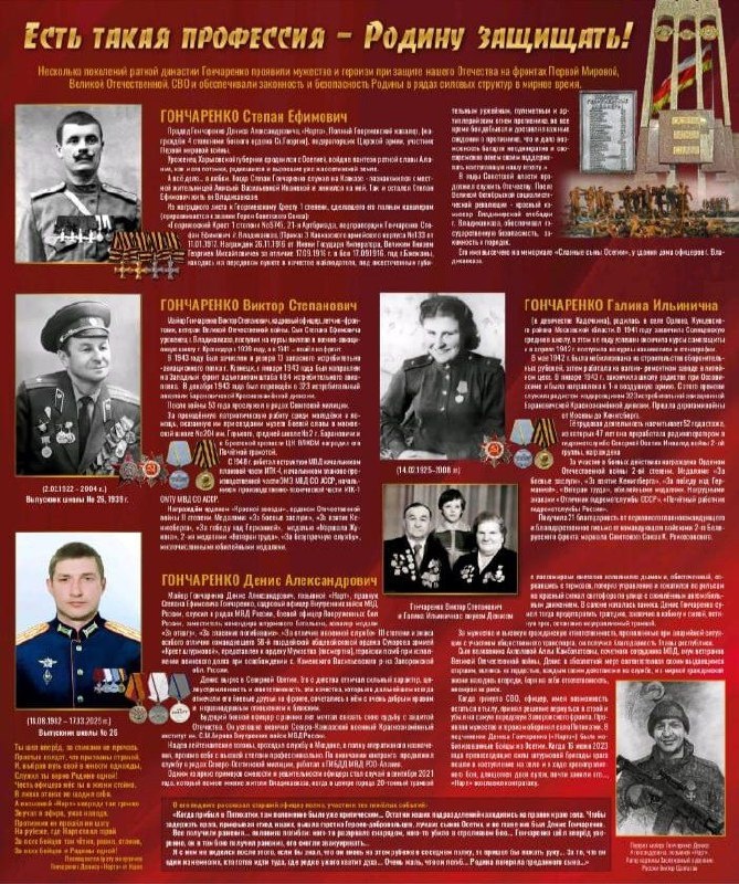 Несколько поколений семьи майора Дениса Гончаренко, "Нарта", в течение трёх эпох вносят неизмеримый вклад в обеспечение защиты и безопасности нашего Отечества: Российской Империи, Советского Союза и Российской Федерации. Прадед "Нарта" - Гончаренко Степан Ефимович, полный Георгиевский кавалер!, (награждён четырьмя степенями боевого ордена Св.Георгия🎖🎖🎖🎖), подпрапорщик Царской армии, участник Первой мировой войны. После Великой Октябрьской социалистической революции - красный комиссар Владимирской слободки города Владикавказа. Дед "Нарта" - майор Гончаренко Виктор Степанович, кадровый офицер, летчик- фронтовик, ветеран Великой Отечественной войны, награждён орденом «Красной звезды»🪖, медалями: «За боевые заслуги», «За взятие Кенигсберга», «За победу над Германией», орденом Отечественной войны II степени🎉. После войны 53 года прослужил в рядах Советской милиции, Ветеран труда. Бабушка "Нарта" - Галина Ильинична Гончаренко (Чаадаева, (потомок древнего дворянского рода), участниц