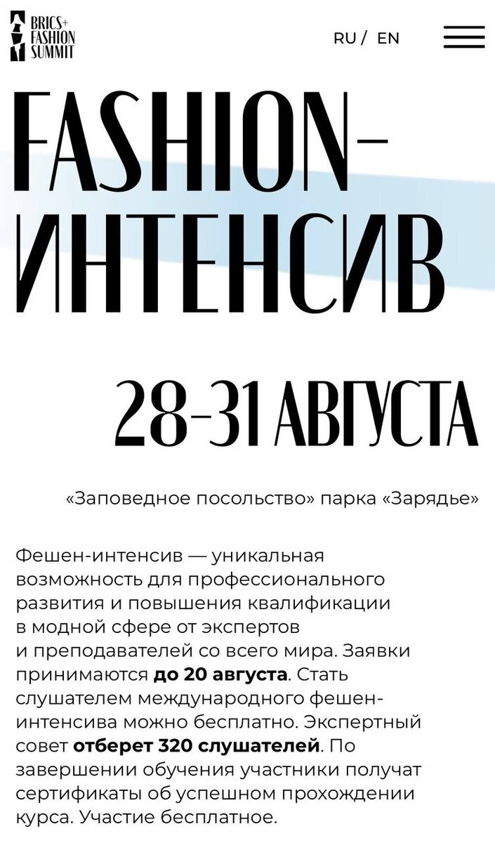 Бесплатное обучение в fashion индустрии Совсем скоро стартует Московская неделя моды, а вместе с ней и Саммит моды БРИКС+, в рамках которого пройдет международный fashion-интенсив от экспертов и преподавателей со всего мира на тему: Переосмысление моды через ремесло, культуру и осознанность. Участие в интенсиве бесплатное, на основе конкурсного отбора, подать заявку можно до 20 августа здесь А также ФОНД МОДЫ совместно с образовательной платформой Академика предлагают к изучению для всех желающих совершенно бесплатно курс «Культурные коды в Fashion”. Правда в описании написано, что на английском языке, не уточняла, но думаю перевод есть, хотя мне не привыкать после обучения в Институте Марангони в Милане, о котором я обещала рассказать😉 Пойдете учиться?) P.S. Сегодня я получила аккредитацию на Неделю моды как МЕДИА, как попасть на Неделю моды писала здесь и здесь