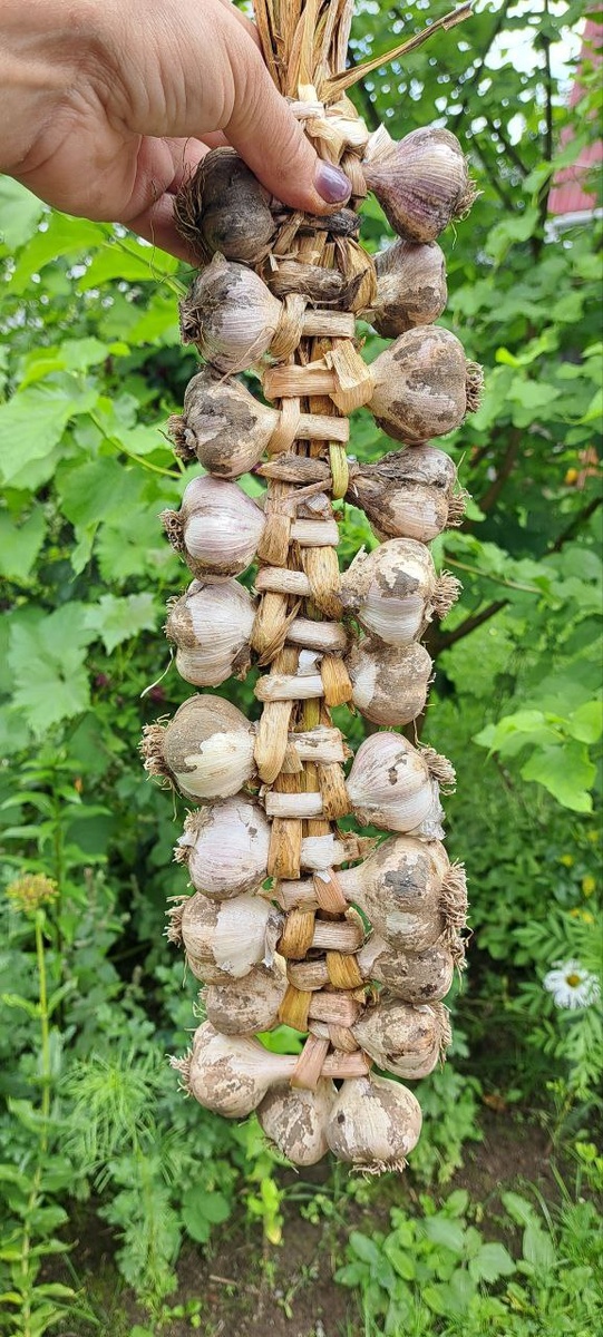 ЧЕСНОК. ЭСТЕТИЧНО. Мы его выкопали, посушили вместе с ботвой и связали в косу. Это один из вариантов плетения чеснока. Этого сорта было немного головок. Поэтому для декоративности выбран этот вариант. Можно повесить для красоты в кладовке или на кухне (смотря какой интерьер и размеры😁). #чеснок #эстетика