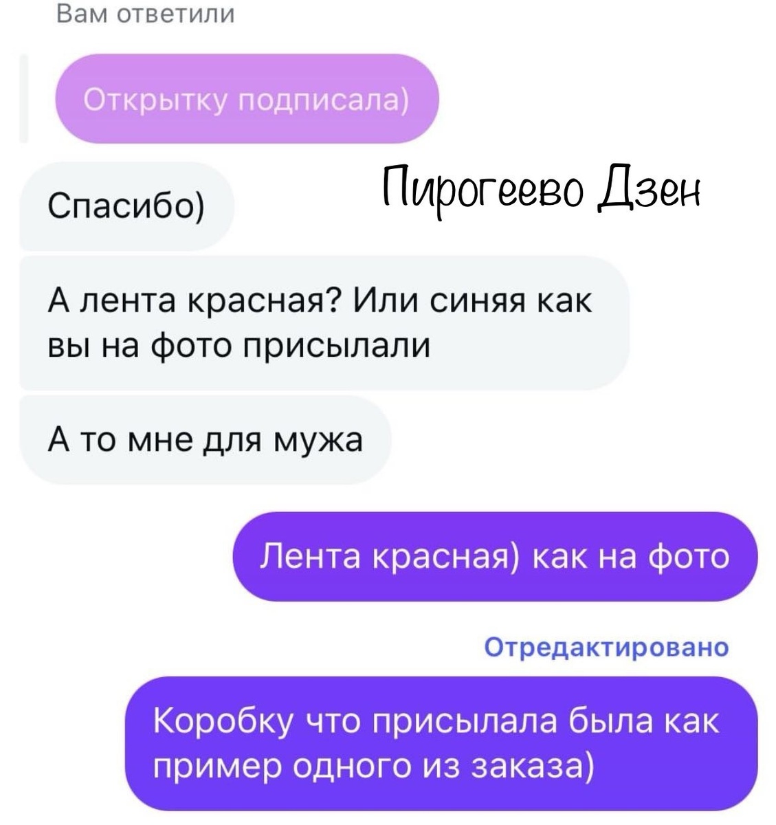 Я отправила фото, как будет выглядеть упаковка (на ней была синяя лента, это был чужой заказ), а потом отправила фото готового заказа уже с упаковкой клиента.