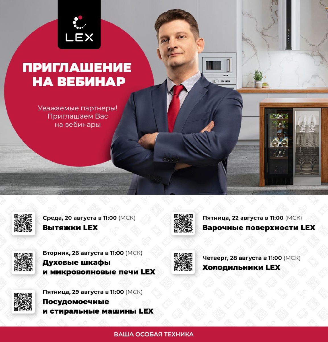 🌟 Приглашаем вас на серию вебинаров, посвященных продукции LEX! 🌟 Дорогие друзья! Мы рады сообщить вам о предстоящих вебинарах, где вы сможете узнать все о продукции LEX. Присоединяйтесь к нам, чтобы получить полезную информацию и задать свои вопросы! ТБМ является официальным дилером продукции LEX, и мы готовы поделиться с вами всеми преимуществами и особенностями товаров для кухни. 📅 Расписание вебинаров: • 20 августа 2025 — Вытяжки LEX • 22 августа 2025 — Варочные поверхности LEX • 26 августа 2025 — Духовые шкафы и микроволновые печи LEX • 28 августа 2025 — Холодильники LEX • 29 августа 2025 — Посудомоечные и стиральные машины LEX 🕒 Время начала вебинаров: 11:00 по МСК. Продолжительность 1 час. Не упускайте возможность узнать о новинках и лучших решениях для вашего дома от LEX!