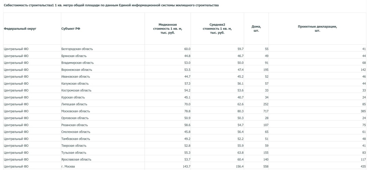 На основании данных Единой информационной системы жилищного строительства (ЕИСЖС) рассчитаны показатели средней и медианной себестоимости строительства 1 м² по субъектам РФ. • Лидером по себестоимости остаётся Москва со средней ценой строительства — 156,4 тыс. руб. за м². • В Московской области — 80,3 тыс. руб./м², что также заметно выше региональных показателей. • Наименьшая себестоимость в округе зафиксирована в Курской области — 40,7 тыс. руб./м²