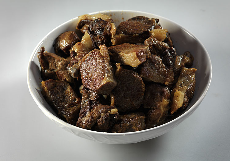 Одно только «но». В готовом блюде я хочу получить богатый, насыщенный вкус. И у меня есть все возможности получить его, ведь я не стеснён обстоятельствами кочевой жизни! Я могу добавить какие угодно специи, какие угодно овощи – слава Богу, всё есть. Но давайте пока попробуем не слишком-то размашисто использовать все возможности кулинарной палитры. Давайте сначала извлечём максимальный вкус и аромат из самой баранины. Поэтому давайте сначала просто обжарим на сковородке баранину разделанную кусками с куриное яйцо. Обжарим и в конце обжарки присолим. Вот – румяная, красивая, ароматная баранина, готовая для дальнейшей готовки в оболочке.