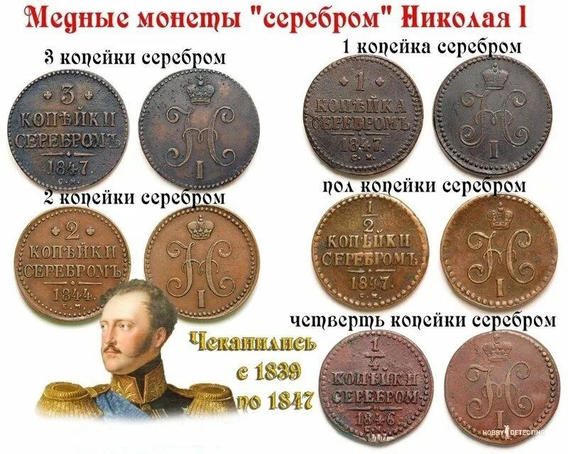 О копейках серебром Одними из самых встречающихся монет Российской Империи являются медные монеты времен Николая Первого с надписью «серебром». Их попадается в земле настолько много, что цена одной монеты редко превышает 150 рублей. Как ни странно, но большинство полагает, что надпись «серебром» обозначает металл монет, т.е. получается, что монета изготовлена из серебра. Однако это не так, даже визуально это видно. Номиналы: 1/4, 1/2, 1, 2 и 3 копейки. Чеканились с 1839 по 1848 годы. Однако монеты последних годов (1848, а у некоторых номиналов и раньше) являются раритетами, т.к. их тираж был очень незначителен. Суть реформ заключалась в том, что в основу монетной системы Российской империи закладывали серебро. Все остальные денежные знаки - медяки, ассигнации, бумажные деньги, монеты из других металлов - получали курс обмена на серебро. От этого и надпись "серебромъ". Спасибо за внимание!