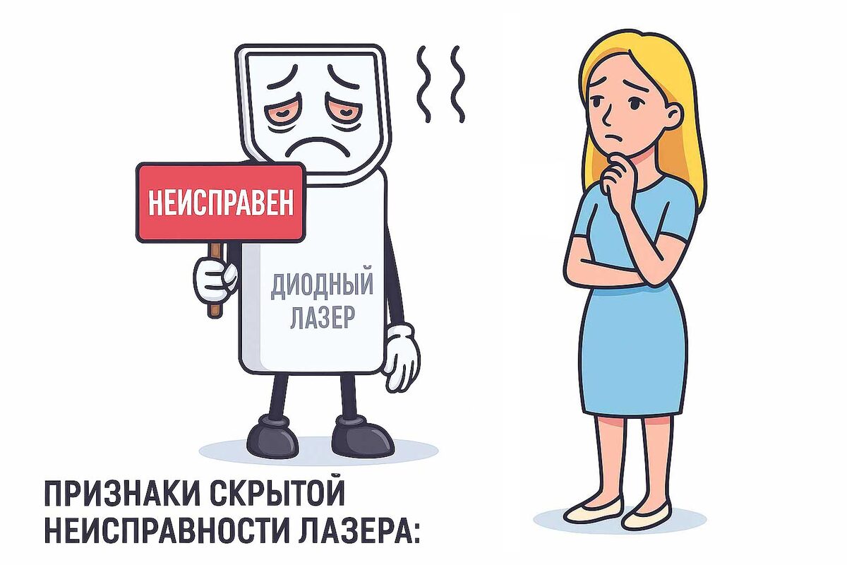 Все эти «мелочи» — предупреждающие сигналы: диодный лазер работает на износ и может в любой момент потребовать серьёзного вмешательства. Как определить первые звоночки и не допустить поломки? Если обработка зоны, занимавшая раньше 5 минут, теперь требует 8–9, а клиент просит сделать дополнительный проход — значит, техника уже не выдаёт нужной мощности.