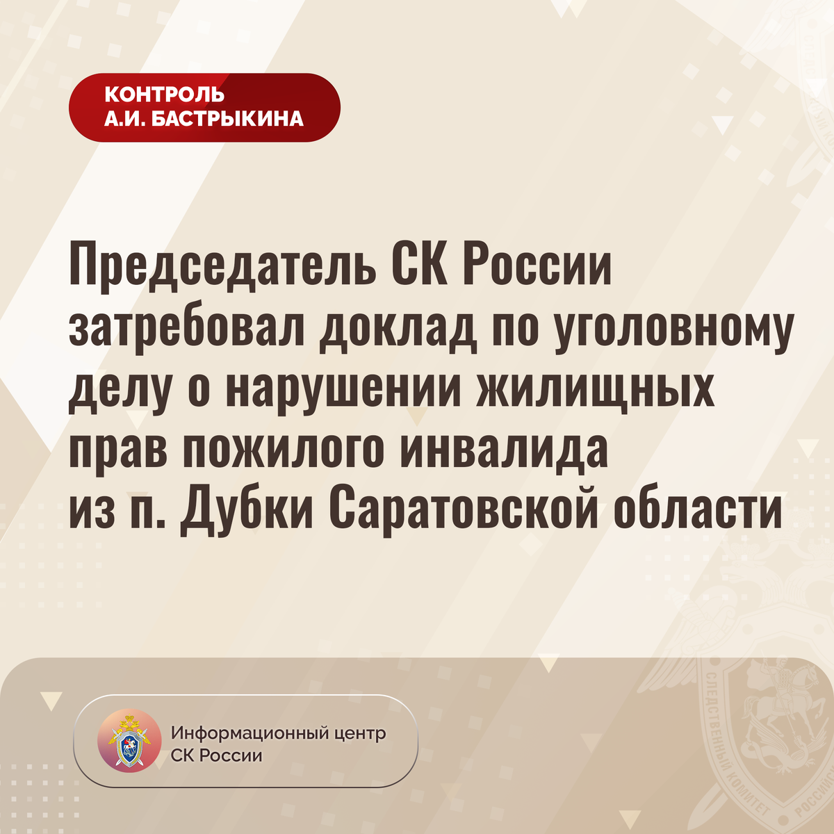 Председатель СК России затребовал доклад по уголовному делу о нарушении жилищных прав пожилого инвалида из п. Дубки Саратовской области