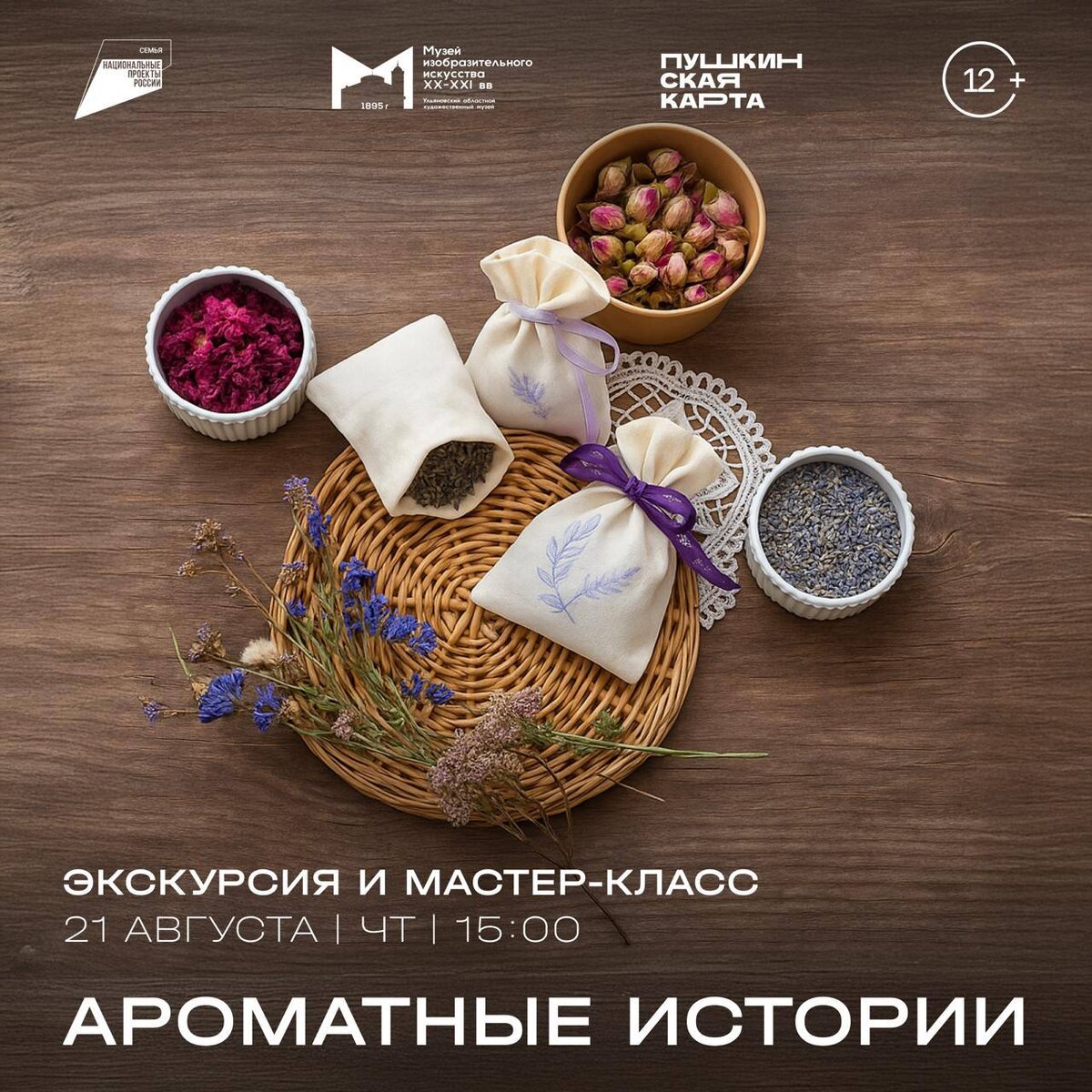 Экскурсия и мастер-класс «Ароматные истории» 🗓️ 21 августа, 15:00 📍Музей изобразительного искусства XX-XXI вв. Приглашаем познакомиться с пейзажами художников XX века, представленных в постоянной экспозиции: Константина Финогенова, Александра Герасимова, Георгия Нисского, Сергея Герасимова, Николая Крымова, Станислава Жуковского, Юлиана Клевера, Константина Коровина, Натальи Гончаровой и других. После экскурсии вас ждет мастер-класс «Ароматные истории», на котором вы научитесь создавать флористические саше. Саше – это тканевый мешочек с сыпучим душистым наполнителем для придания приятного аромата одежде или помещению. Билеты 🎟️ #21августа25