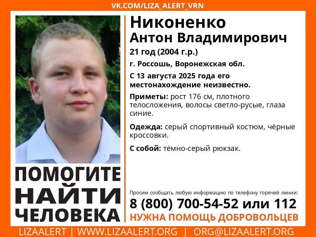 Внимание! Помогите найти человека! Пропал #Никоненко Антон Владимирович, 21 год. г. #Россошь, #Воронежская обл С 13 августа 2025 года его местонахождение неизвестно. Если вы обладаете какой-либо информацией о пропавшем, просьба позвонить по номеру телефона горячей линии отряда 88007005452 (бесплатно по РФ) или 112. ⚡️Подпишись на «Медиа-Х Воронеж»