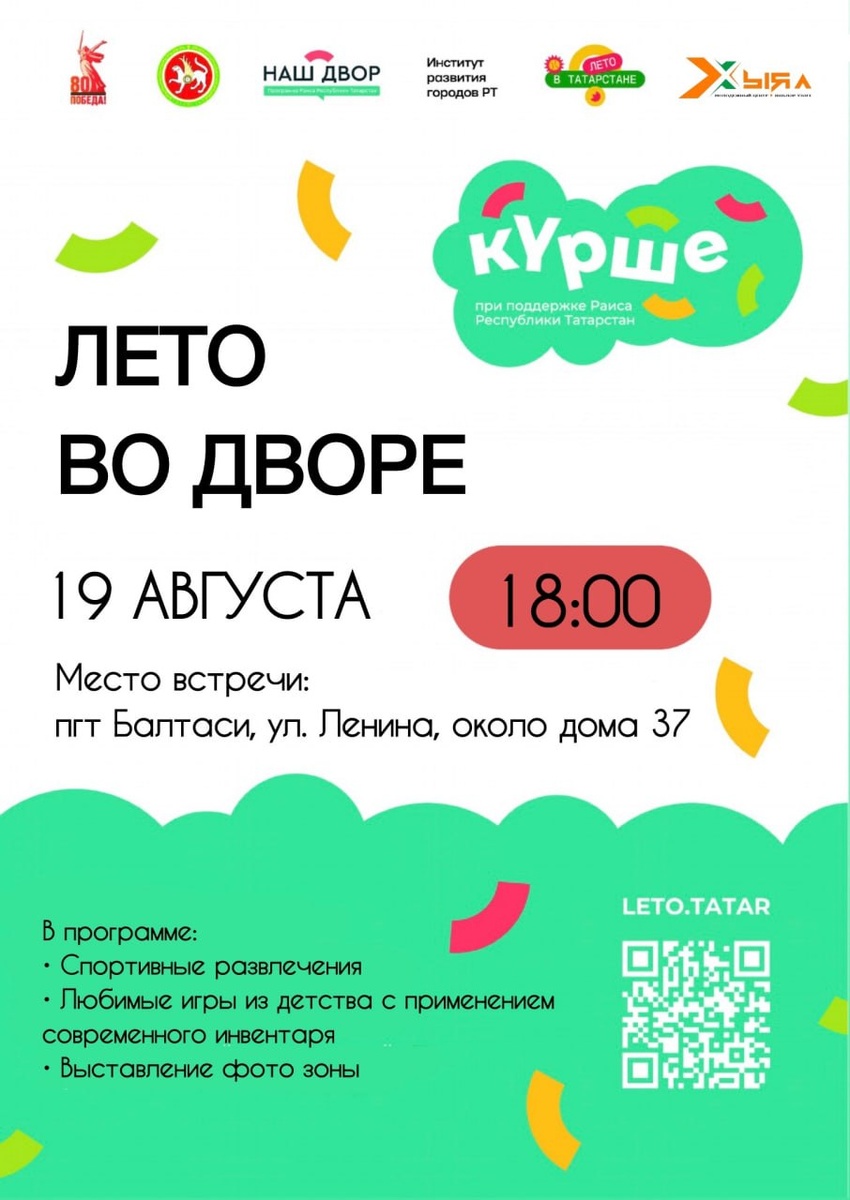 Привет! 👋 Лето подходит к концу, и ты в раздумьях, как провести последние деньки ярко и незабываемо? У нас есть отличное предложение! 😎 Приглашаем тебя на спортивно-развлекательный вечер «Лето во дворе»! ☀️ Когда и где? • 19 августа: пгт Балтаси, ул. Ленина, около дома 37 • 21 августа: пгт Балтаси, ул. Ленина, около дома 133а • 26 августа: пгт Балтаси, ул. Строителей, около дома 5 • 28 августа: пгт Балтаси, Набережная р.Шошма Что тебя ждет? 🤸♂️ Спортивные и развлекательные игры для всех возрастов! 🕹 Возрождение старых добрых дворовых игр с современным инвентарем! 📸 Крутая фотозона, где можно сделать яркие снимки на память! Не упусти возможность весело и активно провести время с друзьями и семьей! 🥳 Приходи, будет жарко! 🔥 #МЦХыял #Балтасинскийрайон #КуршеФест #ЛетоВоДворе