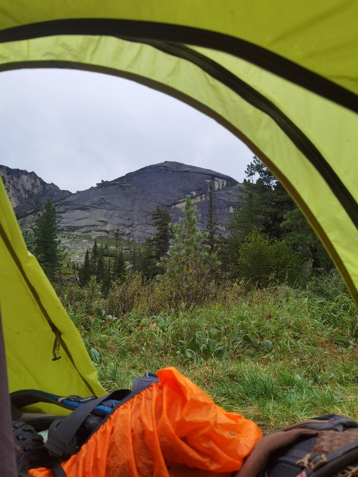 Ночь былапрохладной, всего +4, но мне в моем спальнике на -5 и сухих теплых вещах было комфортно. А вот Олег спальник промочил, как и некоторые вещи, по этому мерз всю ночь. После вчерашнего дня было ясно, что нам необходимо сделать паузу и выдохнуть. Отдохнуть нужно было и физически и ментально, во всяком случае мне. По этому мы решили не ставить будильник, а проспать столько, сколько будет необходимо. Проснулись в итоге в 10 утра. Дождь, к нашему счастью, прекратился, хотя тучи оставались на небе. Пока я проводила утренние сборы и перематывала мозоли, Олег ходил познакомиться с группой, которая вчера прибыла на озеро немного раньше нас. Оказалось, ребята шли похожим маршрутом и тоже решили устроить дневку на озере из-за непогоды. Они пригласили нас погреться и просушиться у костра и под тентом. Это было очень кстати. Также ребята предложили присоединиться к их группе, что мы решили обдумать, так как после вчерашнего дня я сильно засомневалась в том, что мы сможем пройти выбранный мар