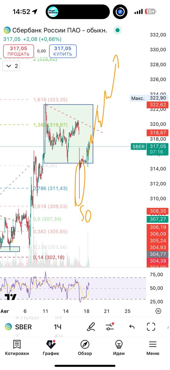 План капкан по Сберу такой, отбой сценария ниже 314, точнее пересмотр. Общий сценарий актуален. Будет волатильно 🙌