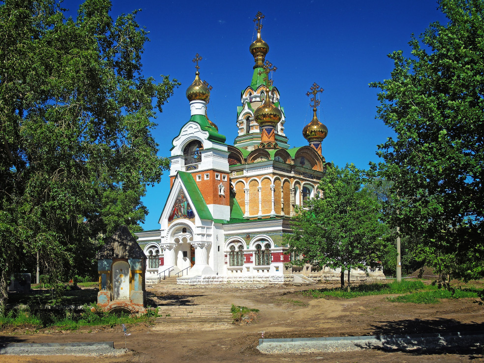 В очередной части приглашаю начать осмотр, пожалуй, самой главной достопримечательности города. Храм во имя Преподобного Сергия Радонежского - уникальный архитектурный памятник не только для Чапаевска, но и для всей Самарской области. Его строительство было начато в 1916 году. Тогда Чапаевск представлял собой рабочий посёлок завода по производству взрывчатых веществ. Курировал его строительство и работу внук Николая I князь Сергей Михайлович, в честь него завод назывался Сергиевским. Кроме того, Сергий Радонежский считается покровителем российских войск. Поэтому и было выбрано посвящение храма именно этому святому.