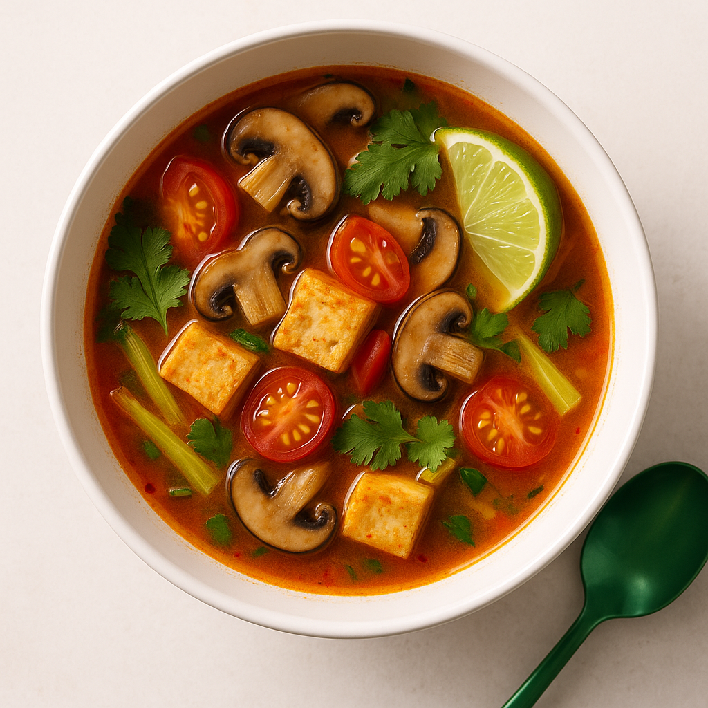 Яркий, кислo-острый и ароматный тайский суп без креветок и рыбного соуса. Умами даём грибами, водорослями и соевым соусом. Можно сделать прозрачный вариант (nam sai) или сливочный с кокосом (nam khon).