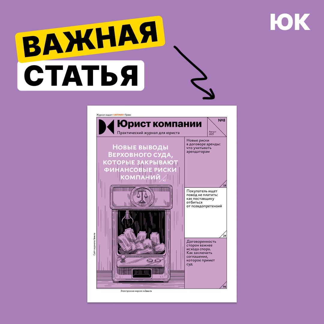 Срок договора аренды истекает: какие риски предупредить арендатору В августовском номере редакция разобрала, с какими рисками сталкиваются арендаторы, когда срок договора аренды истекает. Если своевременно не оценить их и не принять меры, рискуете потерять деньги. Арендодатели все чаще используют формальные поводы, чтобы пересмотреть условия в свою пользу или отказаться от продления. После прекращения аренды состояние помещения отличается от первоначального — это повод для арендодателя предъявить претензии и потребовать компенсацию. 🔍 К примеру, арендодатель добился исключения возведенных на арендованном участке объектов из ЕГРН и обязал арендатора их демонтировать. В другом деле суд отметил: «снос незаконно возведенного объекта входит в программу обязательства арендатора по возврату объекта в соответствии с обозначенными в договоре характеристиками». ↖️ Закажите бесплатный доступ к статье и всему августовскому номеру журнала «Юрист компании» на три дня по этой ссылке>>