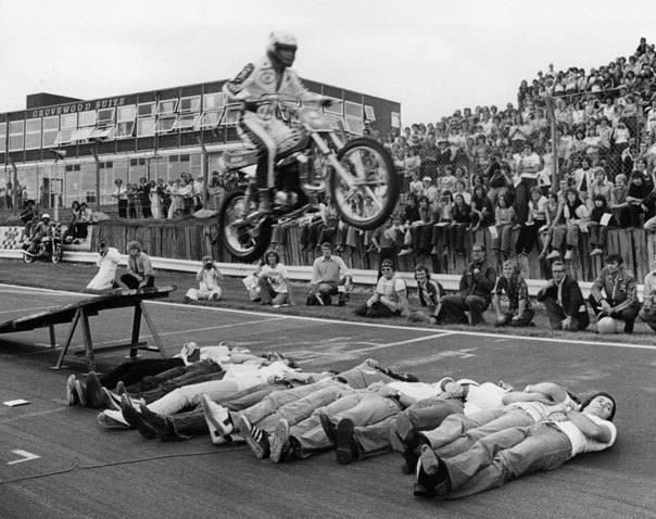 На снимке — риск, скорость и холодный расчёт в чистом виде. Девятнадцатилетний Эдди Кидд, будущее лицо британского стантрайдинга, берёт разгон и перелетает через десять человек, выстроенных цепочкой на асфальте. Никаких страховочных сеток, пневмоматов и сверхлегких каркасов — только траектория, импульс, выверенная работа подвески и железные нервы.