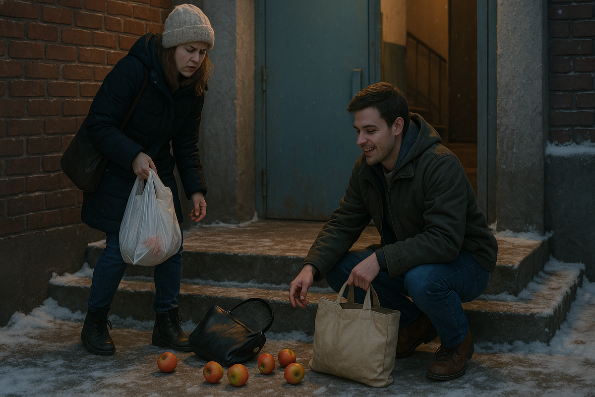 А потом, как назло, рвётся ремешок у моей сумки. Продукты летят вниз, яблоки катятся по крыльцу. Он собирает вместе со мной, смеётся: