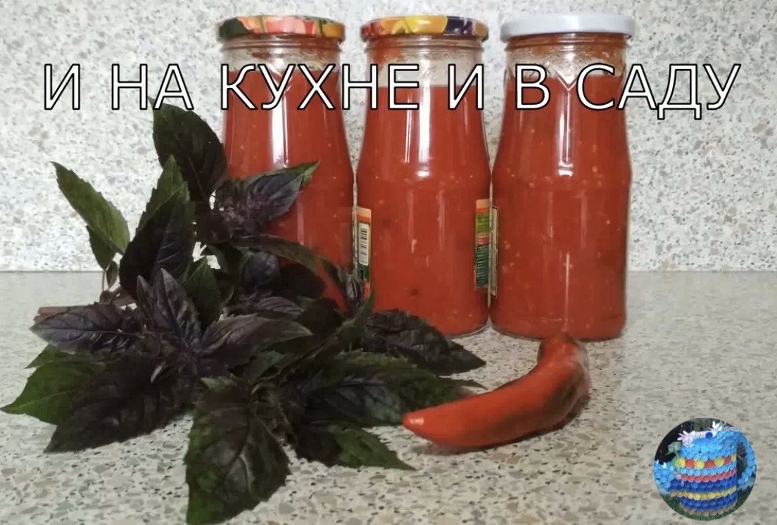 Добрый день, вы на канале И НА КУХНЕ И В САДУ. Сегодня я готовлю пикантный соус с базиликом. Он прекрасно подходит не только к пасте, но и к другим блюдам. Томаты моем и удаляем плодоножки. Произвольно режем на дольки. Перцы моем, удаляем плодоножки, из болгарского удаляем семена. Режем на небольшие кусочки. Подготовим чеснок и базилик. Томаты и острый перец пропускаем в мясорубке с мелкой решёткой. Пюре ставим на средний огонь, добавляем 1 ст.л. соли, 150 гр. сахара, 0,5 стакана растительного масла /80 мл./, массу перемешиваем и доводим до кипения, увариваем пюре до нужной консистенции на минимальном огне переодически помешивая. Пюре загустело, добавляем болгарский перец, для соуса подходит любой болгарский перец, кроме зелёного. Будущий соус варим до готовности или аль денте, не забываем помешивать. В конце варки добавляем 100 мл. 9% уксуса, затем базилик и чеснок пропущенный через пресс, перемешиваем и даём соусу прокипеть 1 - 2 минуты не больше. Количество соли и сахара мож