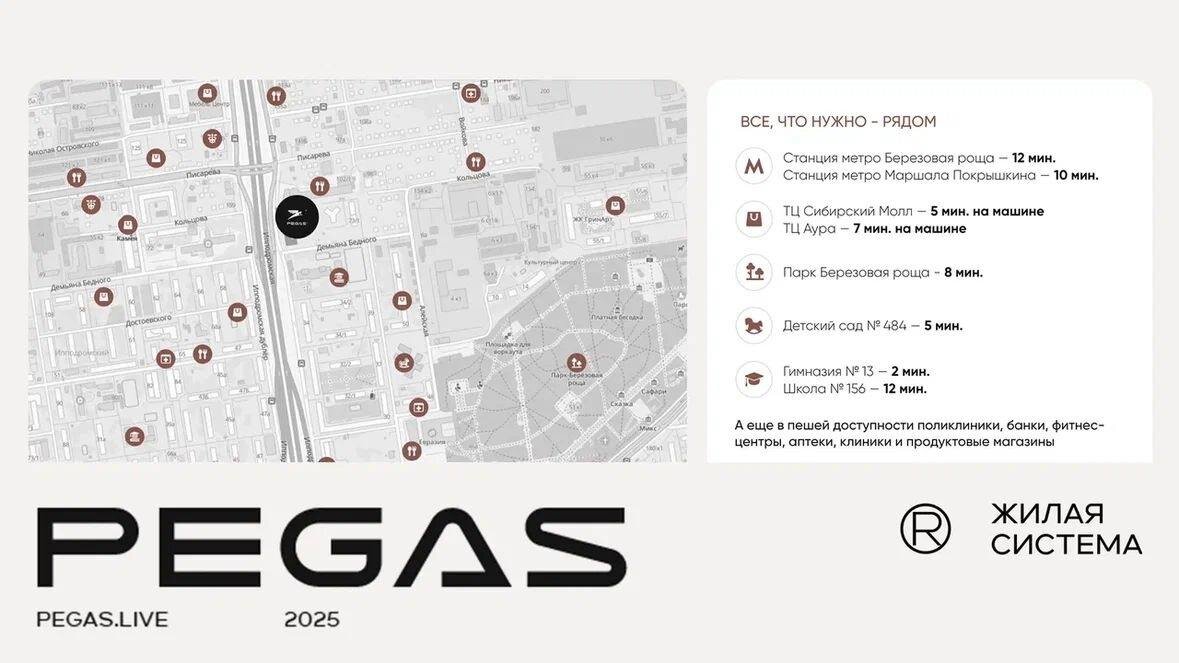 Жилая система PEGAS расположена в центральной части города Новосибирск, вблизи Ипподромской магистрали. Благодаря удобной транспортной развязке и прямому выезду на новый мост можно будет быстро добраться в любую часть города. Рядом находится: ✔️Станция метро «Березовая роща» - 12 минут ✔️Станция метро «Маршала Покрышкина» - 10 минут ✔️ТЦ Сибирский Молл - 5 минут на машине ✔️ТЦ Аура - 7 минут на машине ✔️Парк «Березовая роща» - 8 минут ✔️Детский сад № 484 - 5 минут ✔️Гимназия № 13 - 2 минуты ✔️Школа № 156 - 12 минут В пешей доступности поликлиники, банки, фитнес-центры, аптеки, клиники и продуктовые магазины. Строим город, в котором хочется жить! Наш сайт: www.nsk-kvartal.ru