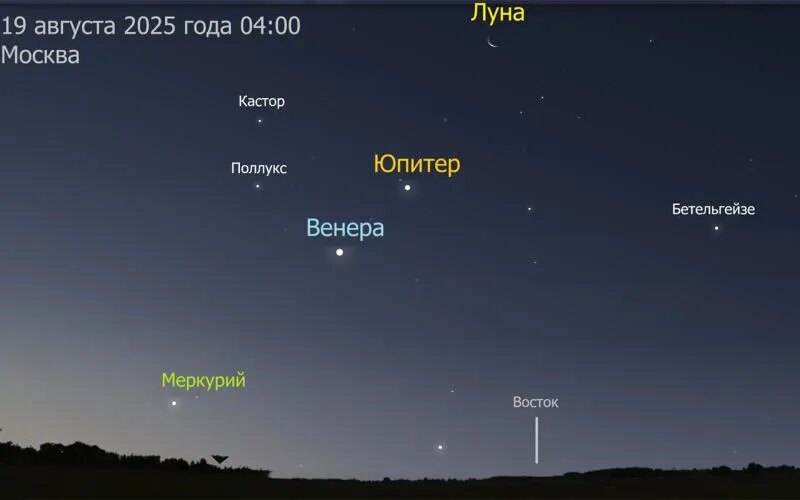 Сразу 4 ярких небесных тела, Меркурий, Венера, Юпитер и Луна выстроятся сегодня ночью в одну линию на небе северного полушария. Увидеть явление можно будет на всей территории России на востоке примерно за 1 час до восхода Солнца по местному времени. Два тела, Венера и Юпитер, находятся рядом уже около 14 дней. Меркурий присоединился к ним только два дня назад. Луна же окажется в нужной позиции только на одну сегодняшнюю ночь и уже завтра переместится в соседний участок неба, сломав строй небесных тел. - 2025-й год оказался богат на недобросовестные сообщения о парадах планет, когда в мнимый строй собирали тела, которые находятся в разных частях неба и зачастую вообще невидимые: Уран, Нептун и даже Плутон. В действительности, глазом с нашей планеты можно увидеть только 6 тел солнечной системы — Луну, Меркурий, Венеру, Марс, Юпитер и Сатурн — сразу четыре из которых сегодняшней ночью выстроятся над восточным горизонтом. Еще один объект из перечня, Сатурн, в этот момент будет находиться н