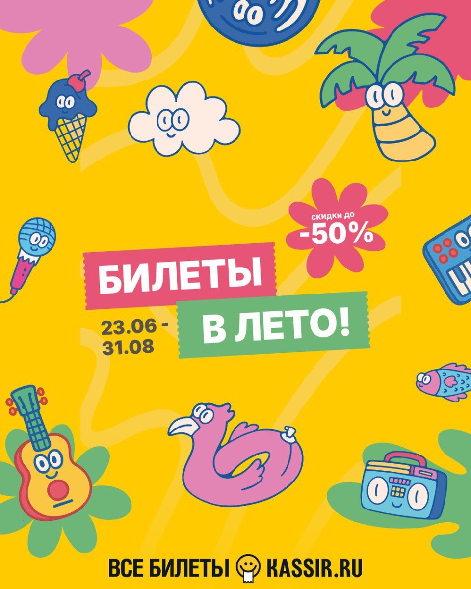 До конца лета осталось всего две недели. Где-то уже чувствуется осень, но у нас всё ещё действует акция «Билеты в лето» 🌞 По приятным ценам можно взять билеты на самые разные события — и не только в августе, но и на будущее. В Петербурге — ледовое шоу Евгения Плющенко с участием Анны Щербаковой, Александры Трусовой и Евгении Медведевой, а ещё моноспектакль Константина Райкина. В Екатеринбурге — концерт Дмитрия Колдуна или рок-опера «Юнона и Авось». В Новосибирске — спектакли «Салон красоты», «Танго втроем» и «Счастливый случай». А в Москве событий так много, что проще самим пройти по ссылке и выбрать своё. 🌞 Переходите на сайт KASSIR.RU и выбирайте свой город, чтобы увидеть больше предложений. Реклама. Информация о рекламодателе. 🙏 KASSIR.RU