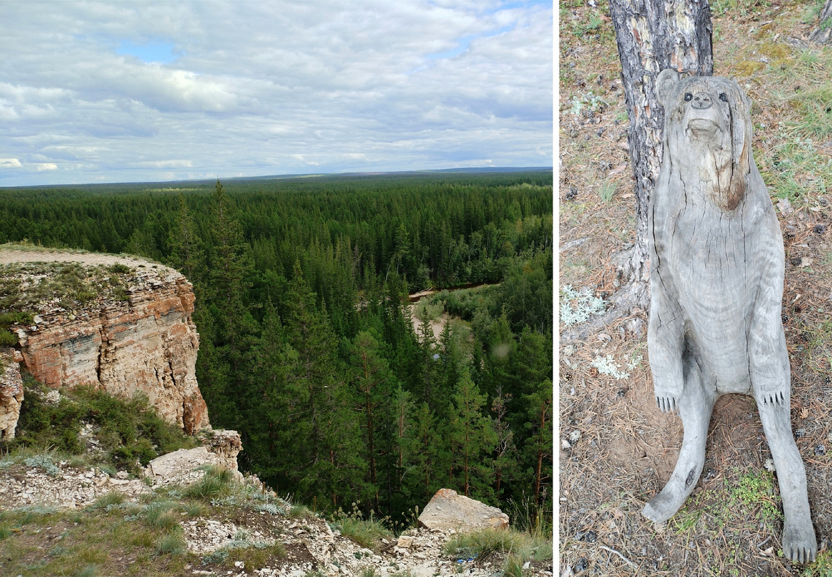 Природный парк «Туруук Хайа» (в переводе в якутского «Отвесная скала») - место, где созданные человеком незамысловатые декорации из натуральных материалов как нельзя лучше подчеркивают величие природных пейзажей. «Туруук Хайа» - скалы высотой около 80 метров и протяжённостью около 50 метров - естественная смотровая площадка живописной долины Самартай. Как и на других природных достопримечательностях Якутии там чувствуется какая-то особая энергетика. Реально место силы! Территория никак не огорожена, надо соблюдать особую осторожность. Некоторые, правда, добирались до подножия скалы по довольно опасному спуску. Я даже близко к краю подходить боялась. Это не помешало любоваться красивой панорамой, наслаждаться тишиной и свежим воздухом. Понравилось, что парк не усложнили чем-то инородным, «пластиковым». Все клумбы, фигурки, скамейки из дерева и камня хоть и выглядят местами уставшими, весьма гармонично вписываются в природный ландшафт. Эта забавная парочка умилила при входе в парк,