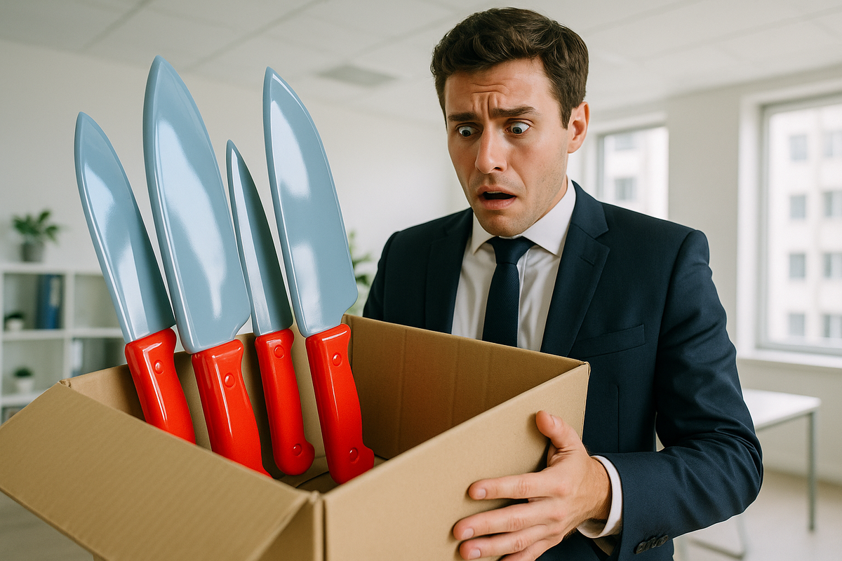Один предприниматель заказал кухонные ножи. На фото в каталоге — стильные лезвия с гравировкой, сталь, достойная дорогого сегмента. Реальность оказалась другой: клинки тоньше визитки, ручки из дешёвого пластика, половины заявленных предметов в наборе вообще не оказалось.