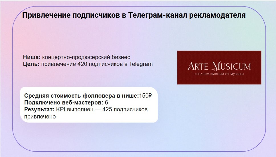 За 2 месяца работы мы провели тестовые кампании, которые включали в себя отбор пула веб-мастеров, разработку креативов, посевы. Рабочая группа показала высокий уровень профессионализма в данном направлении. Видно, что уже отработаны рабочие схемы, пул мастеров, аналитика. В результате тестовой кампании мы увеличили объём подписчиков на 10% и увидели рост продаж с данного источника. Активное развитие Telegram на фоне спада конкурентов, по прогнозам Адмитад, приведёт к увеличению влияния площадки среди источников рекламы для российского бизнесов. Те компании, которые начнут работу в мессенджере сейчас, к концу года получат ощутимый результат в виде лояльной аудитории и стабильного канала продаж. Набираем подписчиков в тг прямо сейчас — читайте советы по работе с одной из самых актуальных площадок.