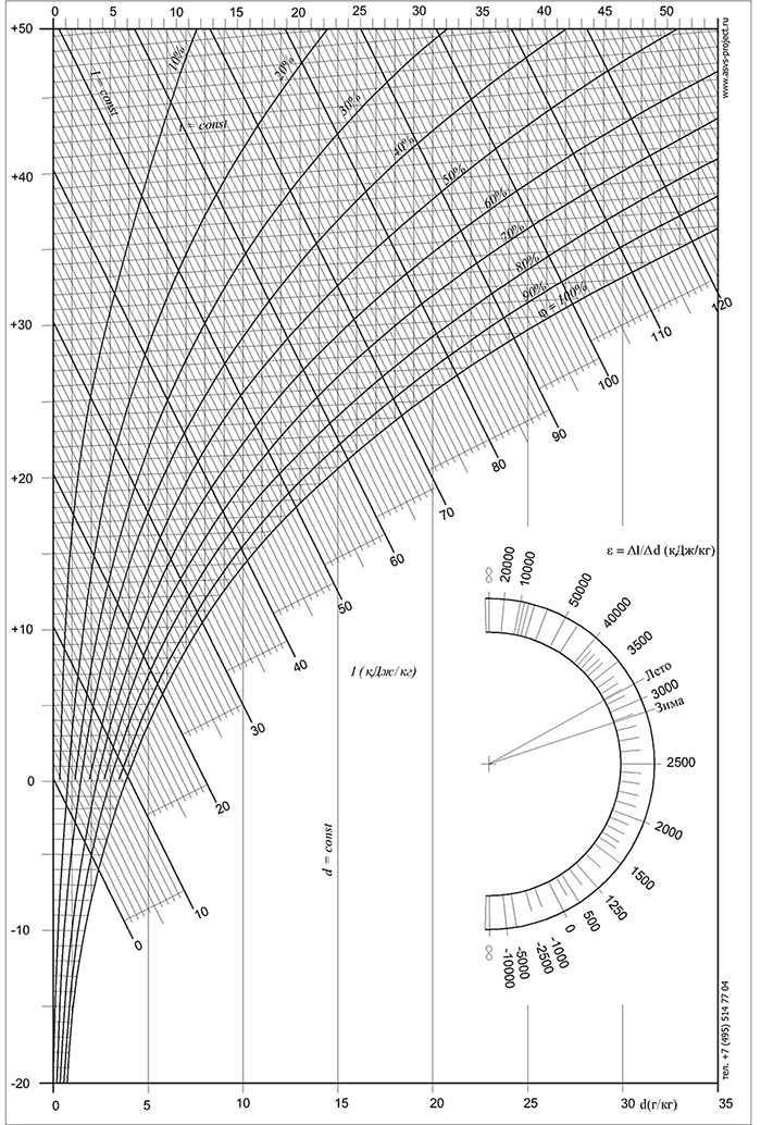 В системах вентиляции и кондиционирования воздуха часто приходится работать с множеством параметров: температурой, влажностью, энергозатратами на нагрев или охлаждение и т. д. i-d диаграмма, или диаграмма энтальпия–влагосодержание (enthalpy–humidity chart), помогает “увидеть” весь этот комплекс на одном чертеже и быстро понять, как меняется воздух в процессе обработки. На горизонтальной оси откладывается влагосодержание воздуха d (в граммах воды на килограмм сухого воздуха), по вертикали — энтальпия i (в килоджоулях на килограмм сухого воздуха). На фоне основных координат нанесены: Диаграмма позволяет наглядно: Представим, что уличный воздух при +5 °C и 60% относительной влажности (точка A) нужно довести до +22 °C и 50% влажности (точка B). – Всегда используйте линейку или циркуль для точного считывания значений энтальпии и влагосодержания.