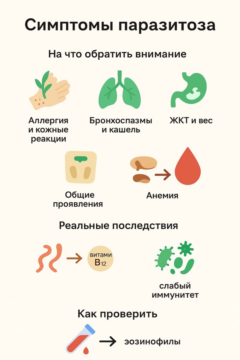 Симптомы паразитоза: когда стоит обратить внимание на здоровье Мы привыкли думать, что паразиты — это что-то редкое и «не про нас». Но на самом деле заражение ими — распространенная история. И важно знать: один симптом еще ничего не значит, но если их несколько, это повод пройти обследование. Только в этом месяце ко мне на консультацию обратились три человека, у которых мы выявили паразитоз – интересно, что все разные: лямблиоз, аскаридоз, бластоцистоз. Всех, я попросила дополнительно сдать на паразитов, потому что были косвенные признаки. Итак на что обращать внимание: Кожа и аллергии Экзема, крапивница, высыпания, зуд век, отёки под глазами. Часто врачи называют это «неясной аллергией», а на деле причиной могут быть паразиты. Дыхание Бронхоспазмы и сухой кашель без температуры, который появляется и исчезает волнами. Иногда такие проявления путают с астмой или бронхитом. ЖКТ и пищеварение Вздутие, боли возле пупка, резкая смена стула (диарея ↔️ запор), тошнота без видимой причины.