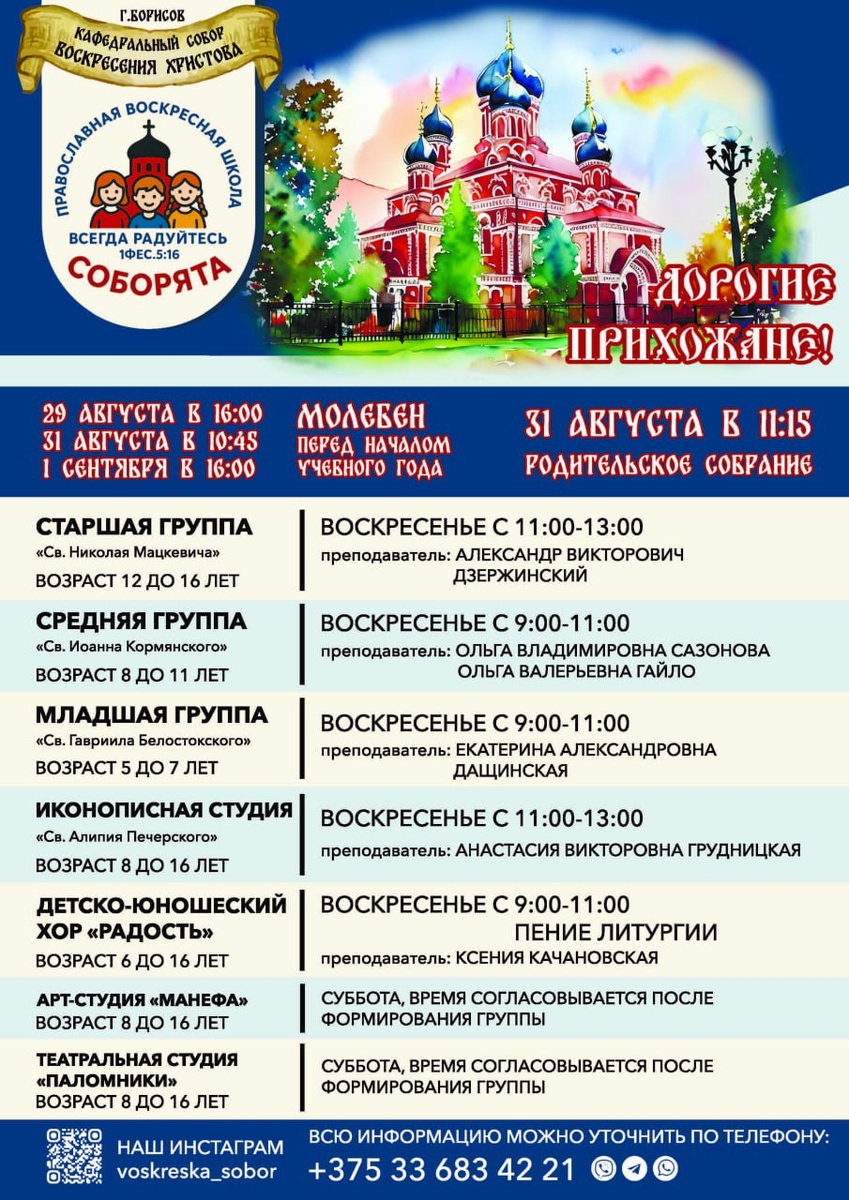С 1 сентября 2025 года начинается новый учебный год в воскресной школе при кафедральном соборе Воскресения Христова г.Борисова. Приглашаем детей и подростков на занятия по православному катехизису, церковному пению, изобразительному искусству и театральной студии.