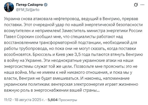 Киев атаковал ведущий в Венгрию нефтепровод, поставки остановлены, сообщил глава МИД Венгрии Петер Сийярто. Он отметил, что подобные действия Украины направлены на то, чтобы втянуть Венгрию в конфликт. А также напомнил, что Киев снова стреляет себе в ногу — венгерская электроэнергия играет жизненно важную роль в энергоснабжении самой Украины. Kiew habe eine Ölpipeline nach Ungarn angegriffen und die Lieferungen seien gestoppt worden, sagte der ungarische Außenminister Péter Szijjártó. Er wies darauf hin, dass solche Aktionen der Ukraine darauf abzielen, Ungarn in den Konflikt hineinzuziehen. Er erinnerte auch daran, dass Kiew sich damit erneut selbst ins Knie schieße – ungarischer Strom spiele eine entscheidende Rolle für die Energieversorgung der Ukraine.