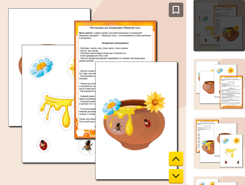 Эта аппликация поможет создать яркое и праздничное украшение для Медового спаса, используя готовые шаблоны. Задание развивает мелкую моторику, внимание к деталям и творческие способности. Готовые шаблоны упрощают процесс вырезания и делают работу доступной даже для самых маленьких детей. Цель задания: Создать аппликацию с изображением мёда и пчел, используя готовые шаблоны для вырезания мёда, пчел и цветов, а затем приклеить их на фон. Материалы для работы: Готовые шаблоны горшка с мёдом, мёда, пчелы и цветов.