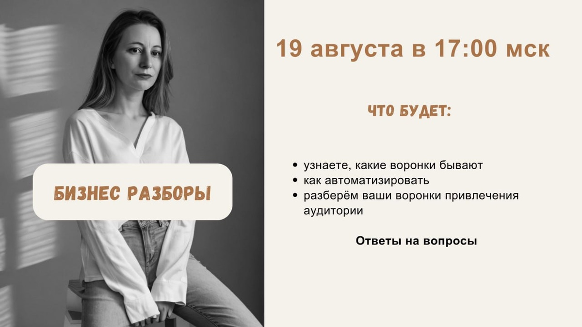 Разборы ваших воронок! Налетай! Только вчера разговаривали со знакомой, как лучше простроить путь привлечения и прогрева клиентов. Как должен попасть к вам человек? Вот попал человек на канал и что дальше? Куда его вести, чтобы он купил? И тут многие скажут: конечно на бесплатную консультацию. А у меня вопрос- всегда ли это рационально? ❌ Если у вас нет понимания, что такое воронки и как они создаются ❌ Если ваши воронки перестали работать ❌ Если хотите усилить свой результат Хотите разобраться, что делать именно вам, 🙂 Жду вас на разборах 19 августа в 17:00 мск Включите уведомление на канале 🔔 чтобы не пропустить. Записи не будет ‼️