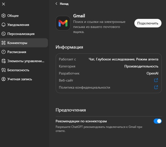 Все платные пользователи ChatGPT получили возможность подключать Gmail и Google Календарь — данные из этих сервисов теперь могут использоваться в ответах модели.