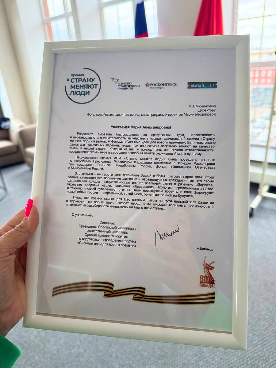 Советник Президента РФ Антон Кобяков поблагодарил Марию Михайлову за участие в премии «Страну меняют люди» Советник Президента РФ Антон Кобяков выразил благодарность основательнице Фонда Марии Михайловой за участие в первой Национальной премии «Страну меняют люди», которая состоялась в рамках V Форума «Сильные идеи для нового времени». Торжественное награждение прошло 15 июля в концертном зале «Зарядье» в Москве. Основатель фонда Мария Михайлова стала одним из лауреатов за весомый вклад в поддержку России. Национальная премия АСИ «Страну меняют люди» была проведена впервые по поручению Президента Российской Федерации Владимира Путина совместно с Фондом «Росконгресс» при поддержке ВЭБ.РФ, Минобороны России, фонда «Защитники Отечества» и Минкультуры России. Подробнее — на сайте Фонда Марии Михайловой по ссылке.