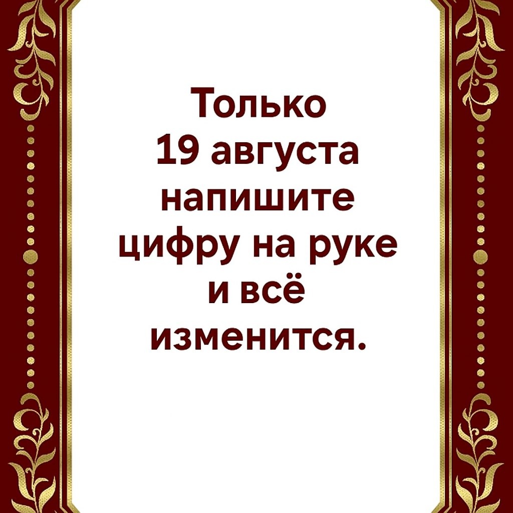 Я открываю Вам древний ключ, который очень редко передавался открыто. Сегодняшний день — особенный. 19 августа — это врата для замысла. Напишете цифру «1» на своей руке — и проявите начало того, о чём мечтаете.