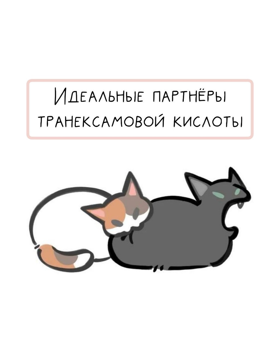 Транексамовая кислота: с кем дружит, а с кем ссорится? Одинокий воин редко побеждает. Транексамовая кислота (TXA) тоже показывает максимум, когда действует в команде. Но есть среди них настоящие дружбаны, а есть те, кто скорее устроит войну на вашей коже Идеальные партнеры 1. Ниацинамид (B3) самый сильный дуэт. Вместе гасят пигментацию с разных сторон и укрепляют барьер 2. Витамин С (SAP, AA2G, этил-аскорбиновая кислота) TXA работает в глубине, витамин С осветляет уже существующие пятна и защищает от свободных радикалов. Итог: сияние и профилактика новых пятен 3. Арбутин, альфа-арбутин, руцинол, койевая кислота: классические осветлители, которые TXA дополняет противовоспалительным действием 4. Азелаиновая кислота (5–10%) идеальна для кожи с акне, постакне и розацеа: вместе с TXA успокаивает, лечит и осветляет 5. Барьерные помощники (церамиды, пантенол, гиалуронка, сквалан) делают использование TXA комфортным и усиливают её защитный эффект Опасные союзы 1. Сильные кислоты низкого