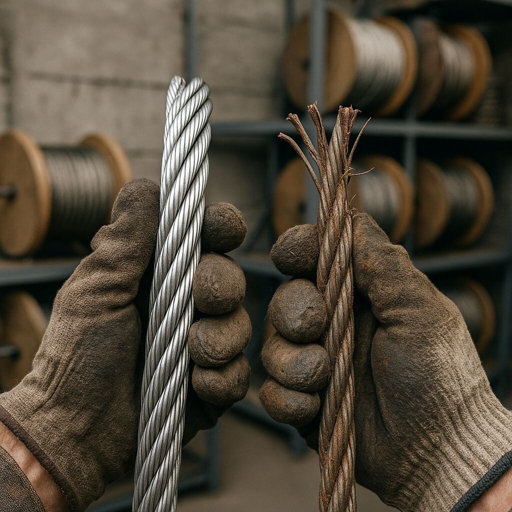 Коррозия - это процесс окисления металла под воздействием влаги, солей, химических веществ и механических нагрузок. Она снижает прочность каната на 20-50%, а в критических случаях приводит к внезапному обрыву. Важно понимать, что коррозия каната бывает двух типов: